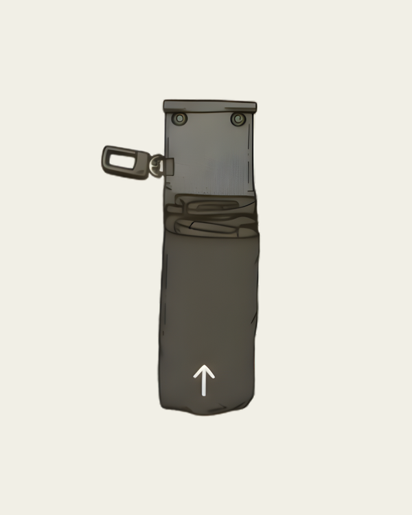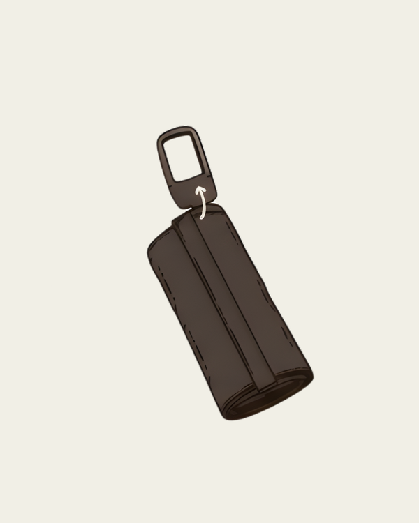 Once rolled, gently slide the tote into the keychain sleeve from the bottom. Push it all the way up until it sits neatly inside.